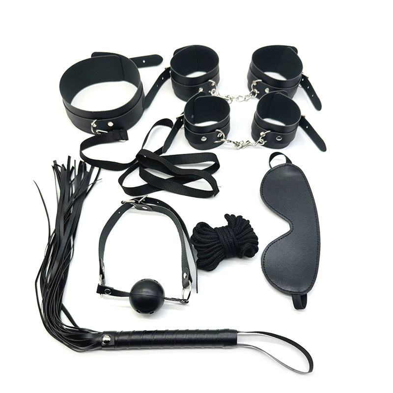 Prefer black for your bondage kit? We have you covered. This kit includes a collar, leash, hand cuffs and ankle cuffs, rope, ballgag, eye mask and whip.