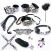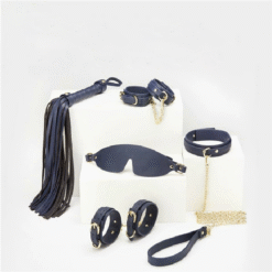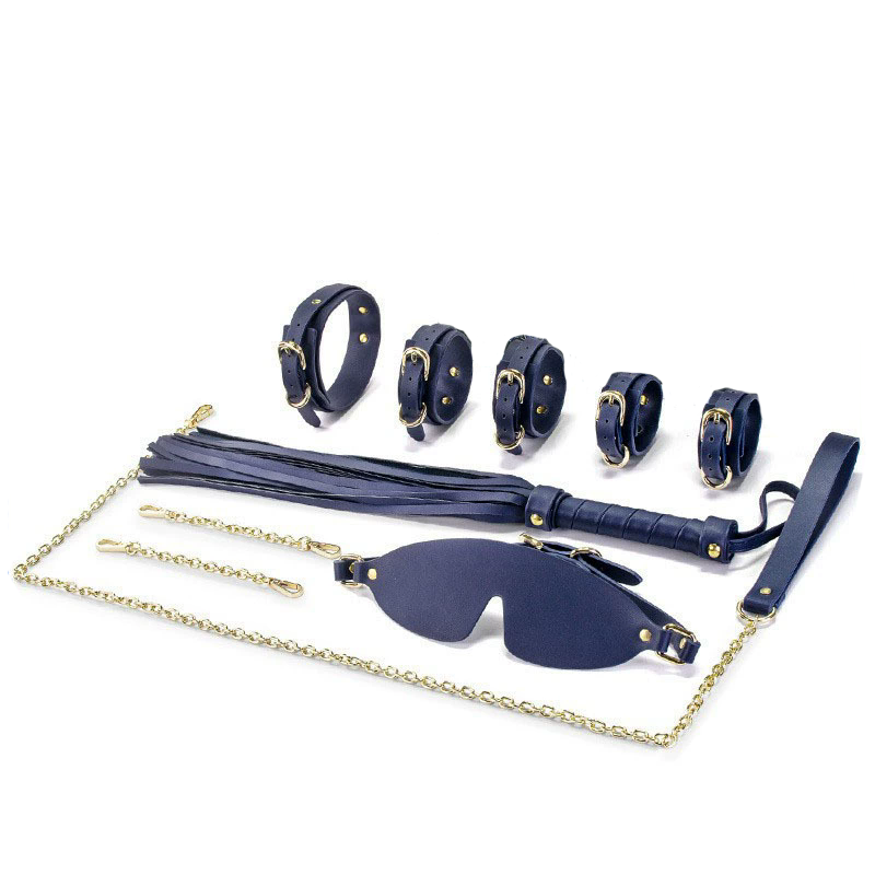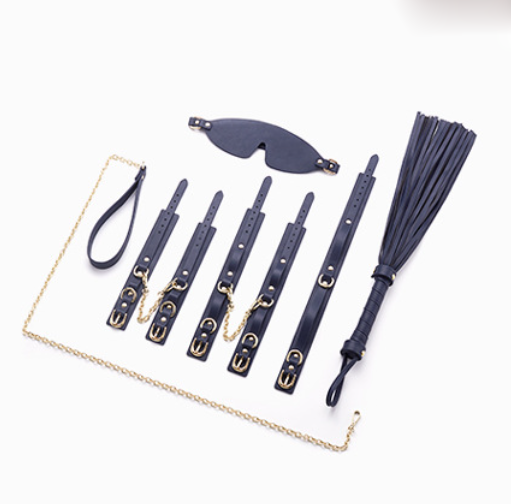 We have entry level priced bondage kits, then we have THIS!!! This is our top of the line kit, made from genuine cow leather, utilizing high quality gold plated locking buckles. The kit comes with a whip, hand cuffs, ankle cuffs, collar, leash, eye mask, and cute leather carry case.