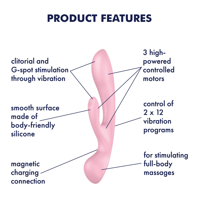 Oh, oh, ohhh yes! With 3 powerful motors, the versatile Triple Oh can be used as a rabbit-style vibe to arouse your G-spot and clitoris or use the opposite end as a massage wand. The massage wand is perfect for full-body massages or to explore any erogenous zone. Rather a connoisseur’s product, the Triple Oh will bring your pleasure experience to new heights. Both the edged shaft as well as the pointed massage head are slightly flexible but stay firm in place for ease of handling. With 3 powerful motors, independently control the rabbit motors and the wand motor. Use the +/- buttons to control the 12 vibration programs of the rabbit, and the ~ button to control the additional 12 vibration programs of the massage wand. The Triple Oh is made of body safe silicone, is rechargeable and waterproof (IPX7). Oh, yes indeed!