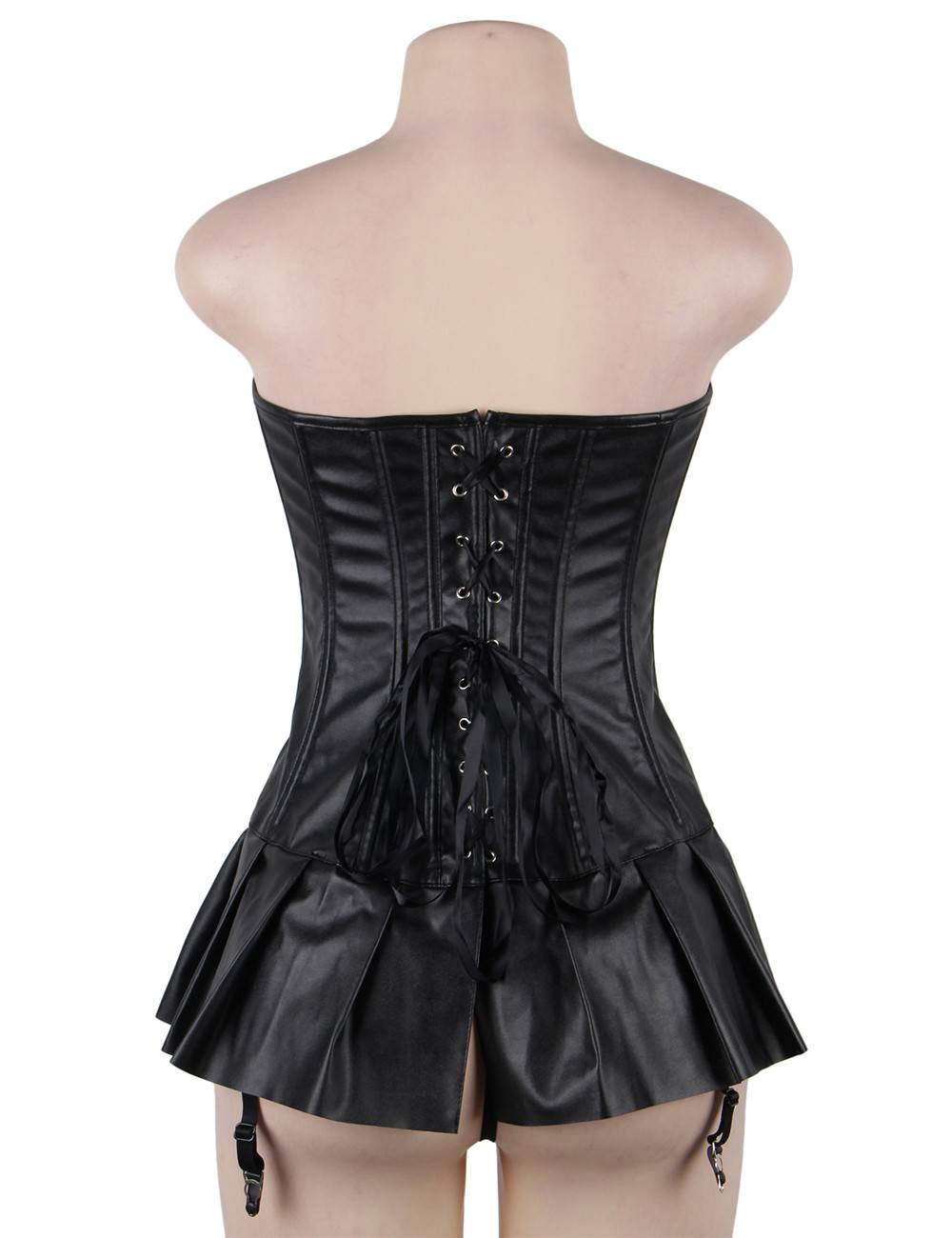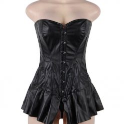 Sexy Leather Look Corset With Skirt. G-string included. Available in various sizes.